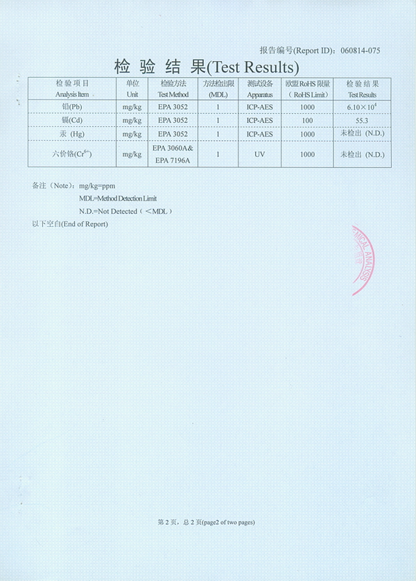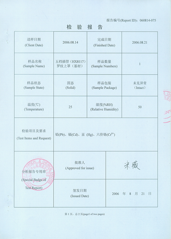 RoHS 证书 五档插管(HX8117)罗纹上罩(基材)