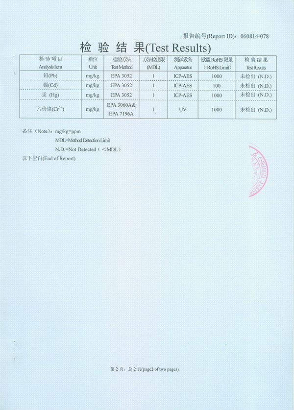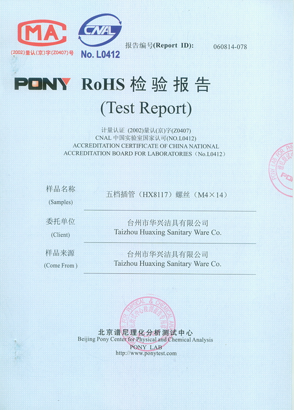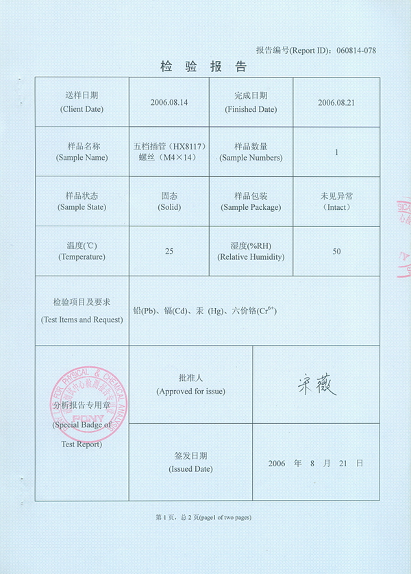 RoHS 证书 五档插管(HX8117)螺丝(M4×14)