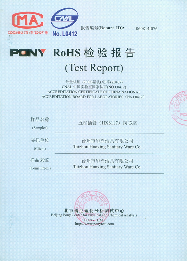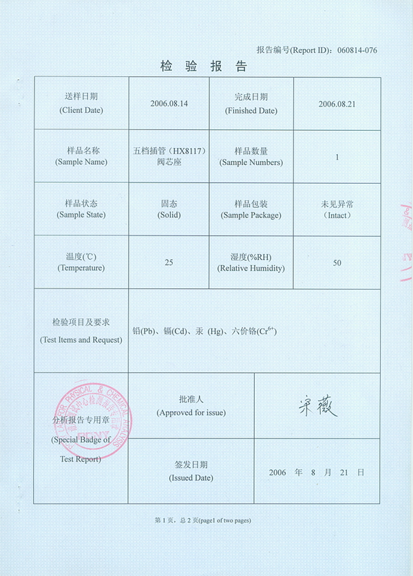 RoHS 证书 五档插管(HX8117)阀芯座