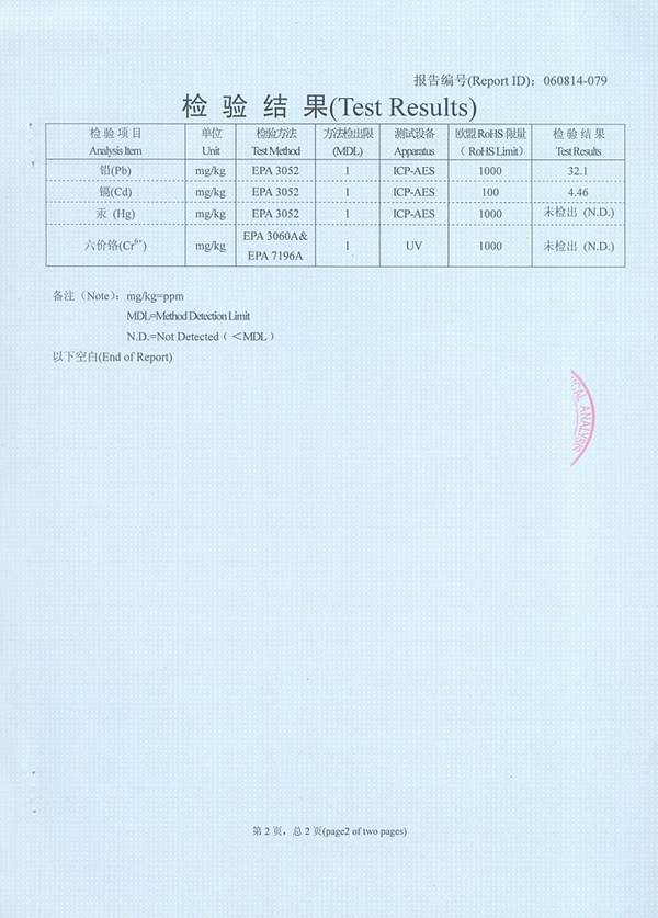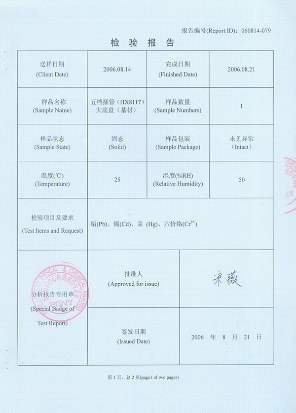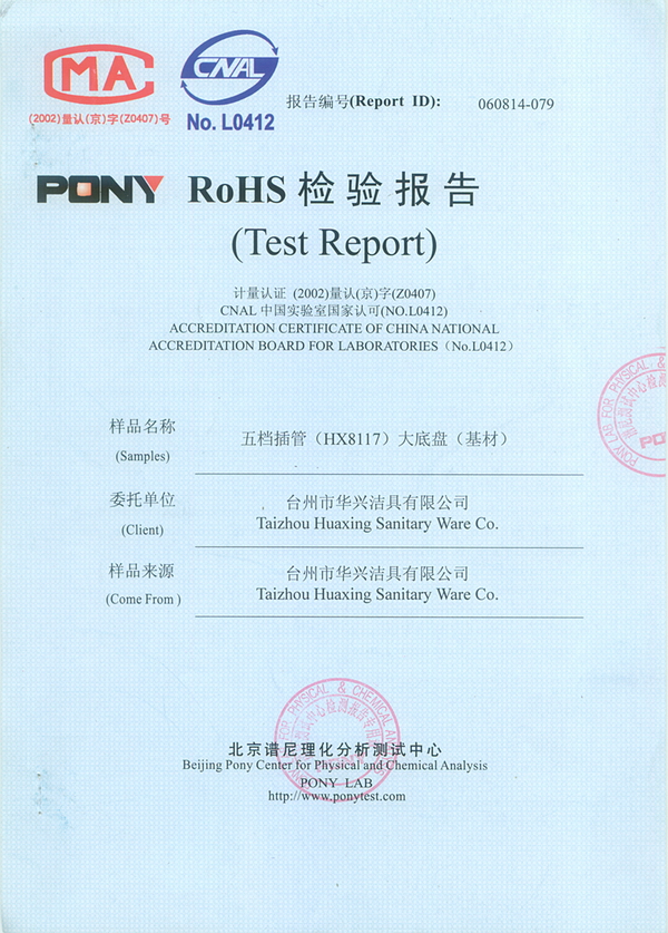 RoHS 证书 五档插管(HX8117)大底盘(基材)